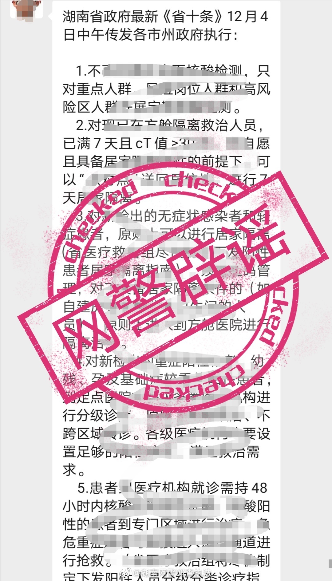 【#网警辟谣#】经向相关部门核实,今日网上流传的“湖南省政府最新《省十条》12月4日中午传发各市州政府执行”的消息是不实信息,省政府近日截止目前并未发布如附图所示的所谓的“省十条”。