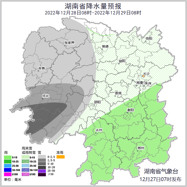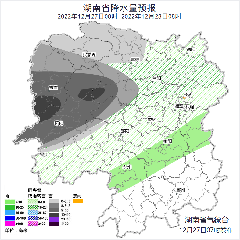 受高空波动及地面冷空气共同影响,27日白天湘西北部分地区有雨夹雪;27日晚至28日白天为主要降雪时段,湘西部分地区中雪,局地大到暴雪,最大积雪深度为4~8厘米;28日晚至29日降雪自北向南减弱。具体预报: