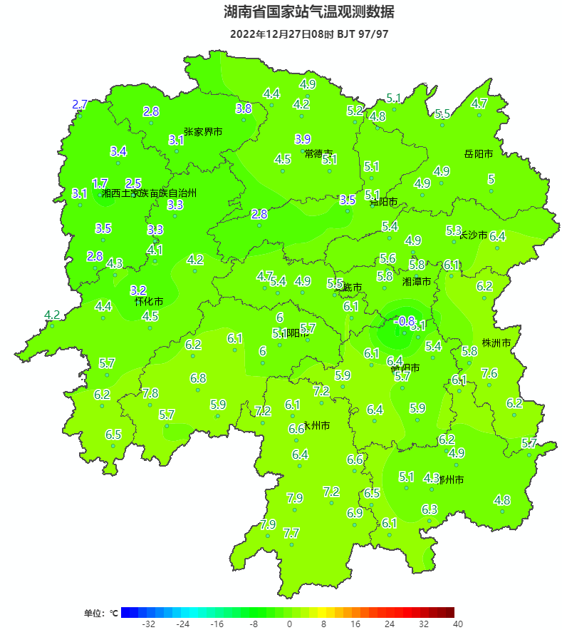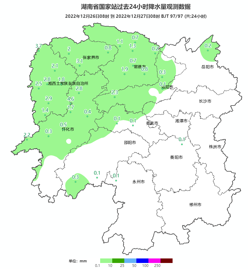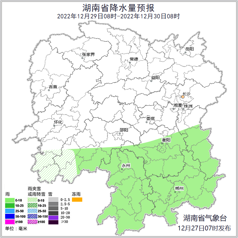 26日08时至27日08时,湘西州、张家界、常德、益阳、娄底西部、怀化中北部出现小雨,其中保靖出现雨夹雪,张家界、常德高海拔山区出现纯雪,其他地区阴天;当前(08时)气温湘西北3~5℃,其他地区5~7℃。