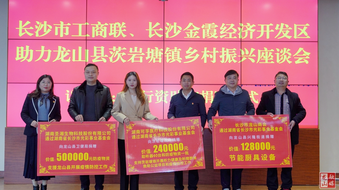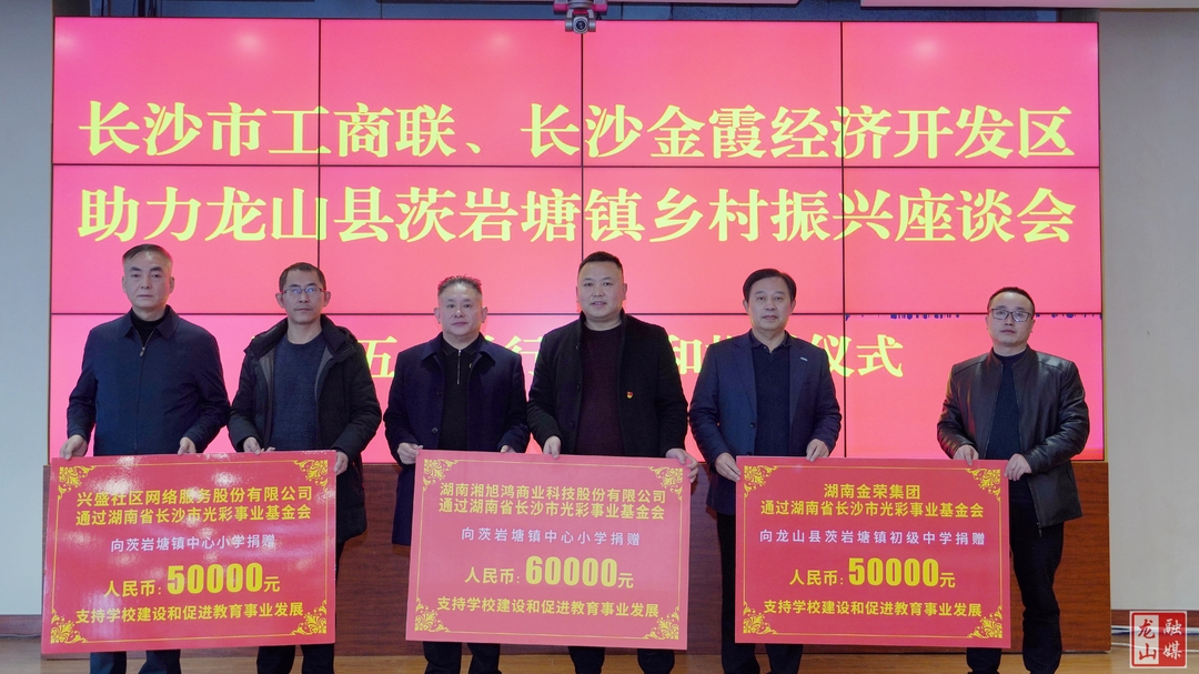 仪式上,长沙金霞经济开发区向茨岩塘镇政府资助产业发展资金50万元;长沙市工商联向茨岩塘镇政府资助产业发展资金30万元;圣湘生物向龙山县卫健局捐赠价值50万元的防疫物资;可孚医疗向茨岩塘镇政府捐赠价值24万元的助听器40台和防疫物资;长沙市龙山商会向龙山县兴隆街道捐赠价值12.8万元节能厨具;湖南湘旭鸿商业科技股份有限公司向茨岩塘镇中心小学捐赠人民币6万元;兴盛社区网络服务股份有限公司向茨岩塘镇中心小学捐赠5万元;湖南金荣集团向龙山县茨岩塘镇初级中学捐赠5万元;部分企业家代表进行了发言。