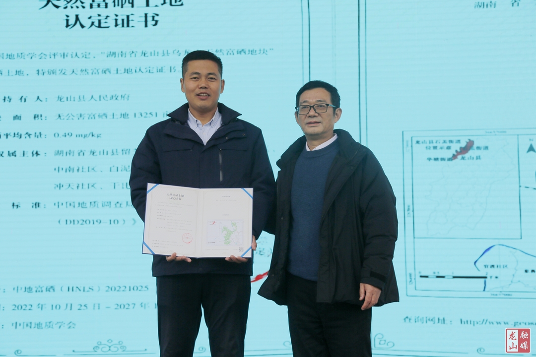 湖南省地质学会秘书长李贵仁向龙山县颁发“富硒土地认定证书”