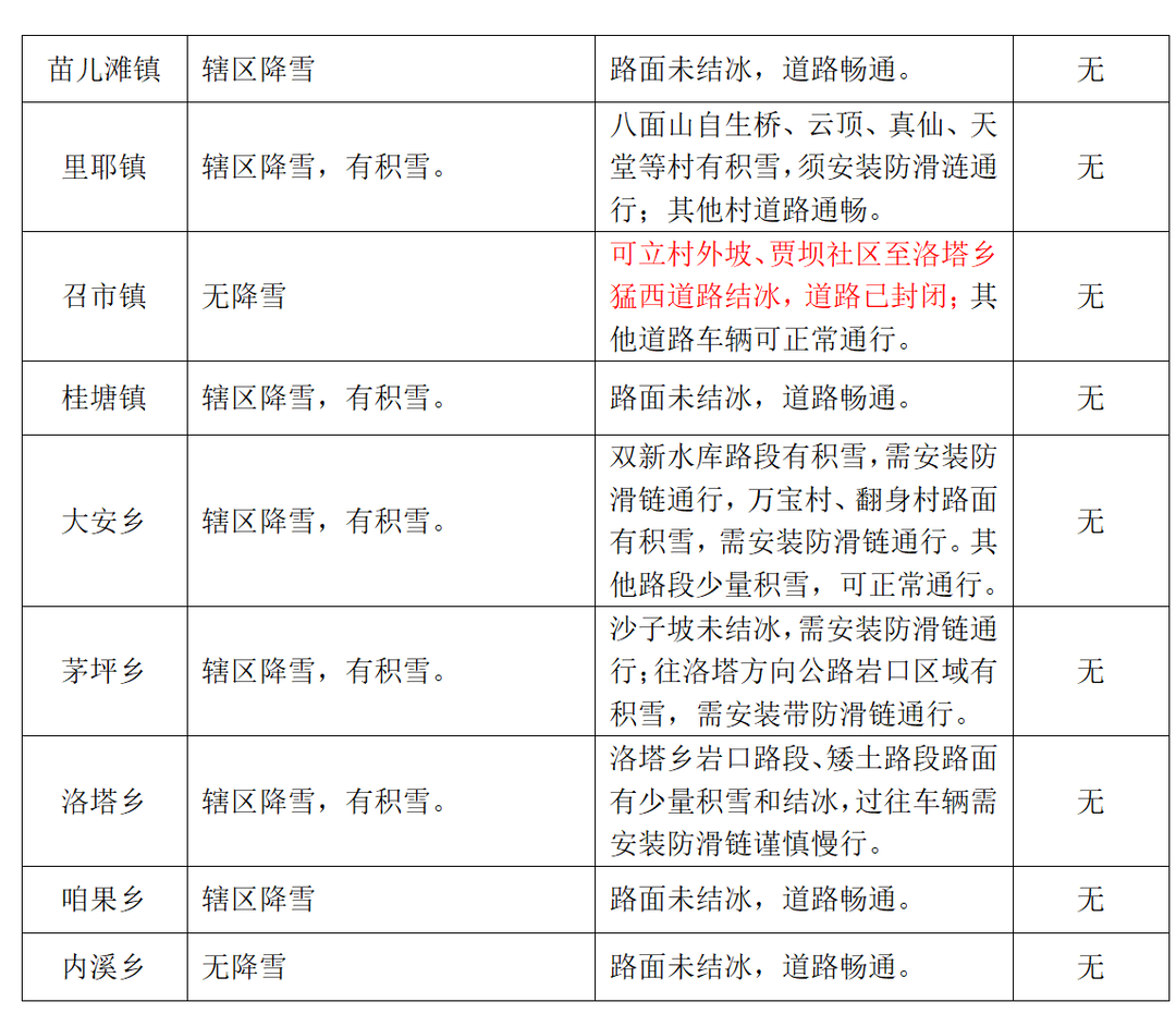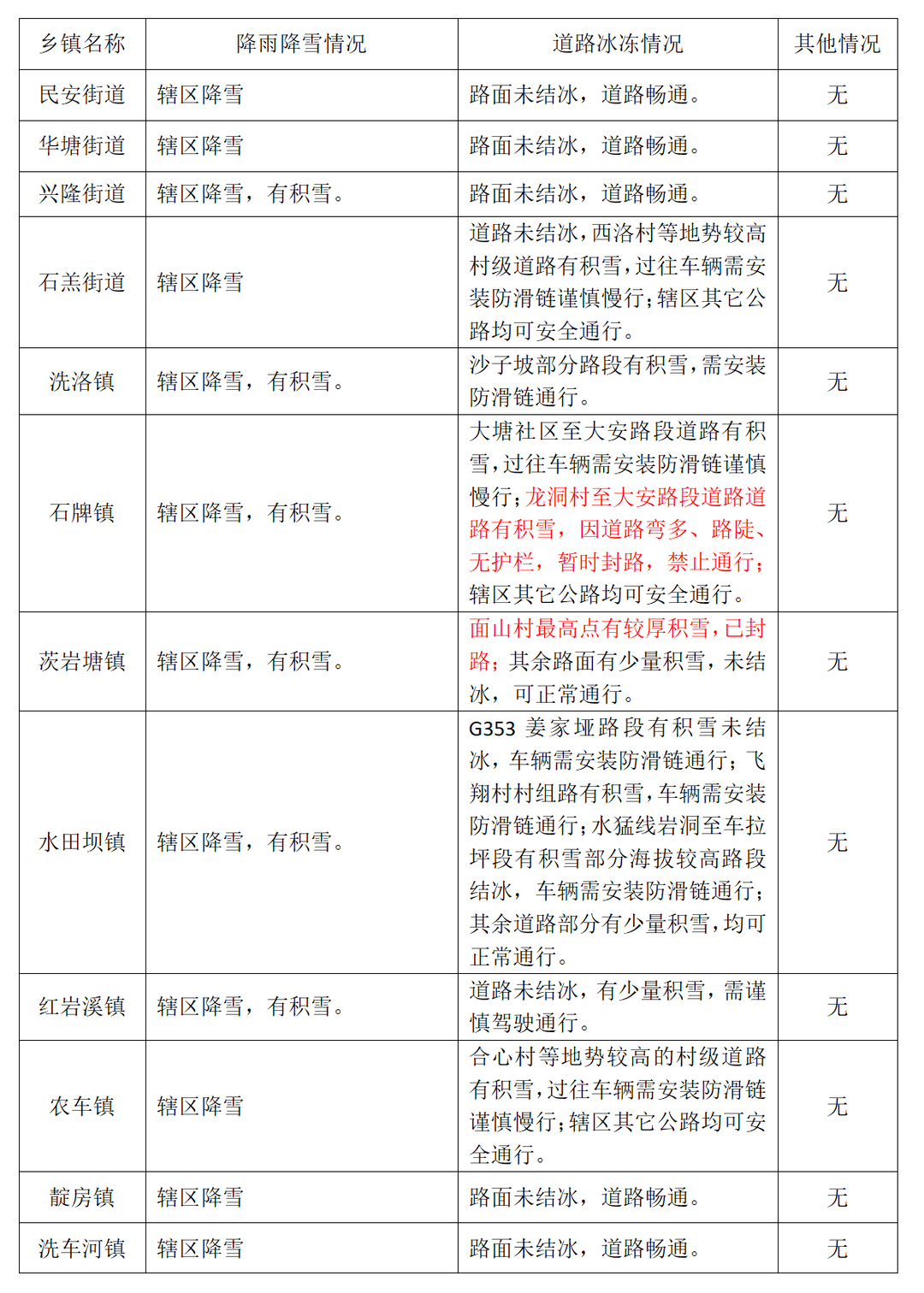 请各乡镇、街道和县直有关单位密切关注气象部门和县低温雨雪冰冻灾害应急指挥部办公室发布的气象信息、工作信息(详见县防汛抗旱工作指挥部微信群),落实应急响应责任和措施,切实加强道路巡查管控,确保安全稳定。