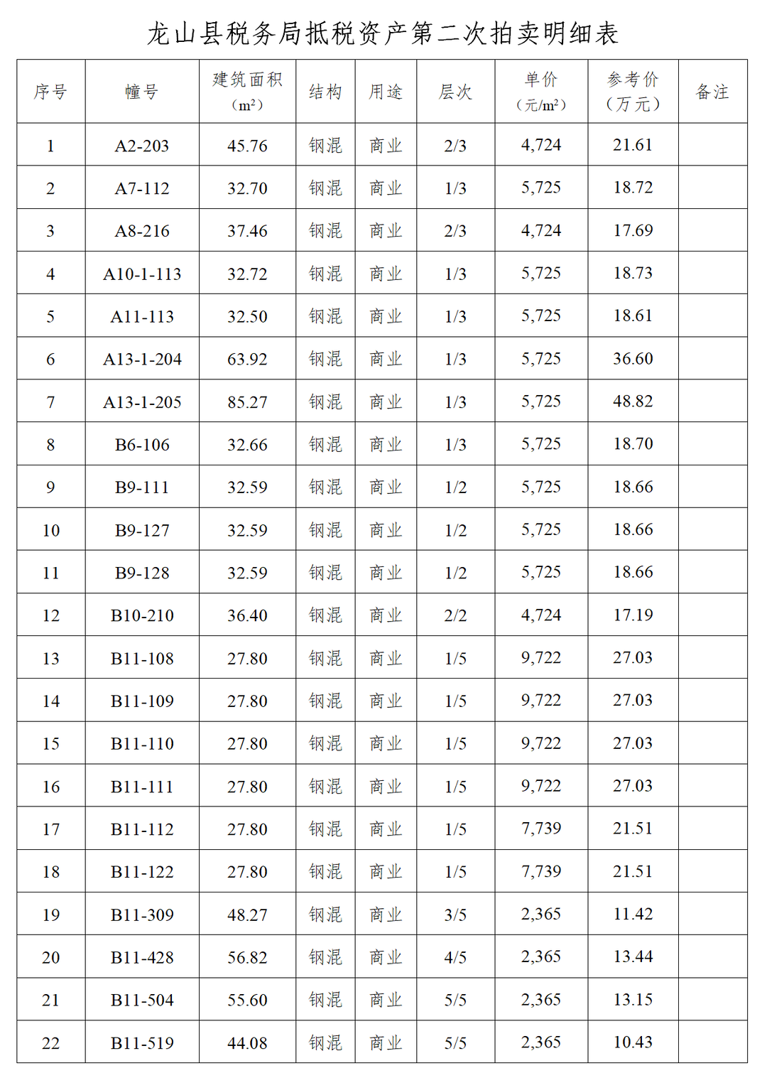受国家税务总局龙山县税务局委托,本公司将于2023年2月14日上午9:38分在龙山县华塘新区健坤教育大厦三楼会议室(电梯旁第一间),依法对以下抵税资产进行第二次公开拍卖,现将有关事项公告如下: