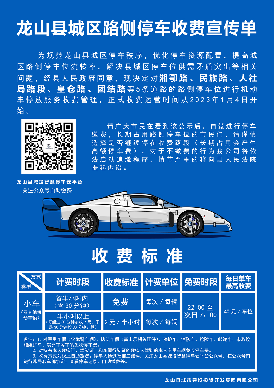 关于龙山县城区路侧停车位收费的公示