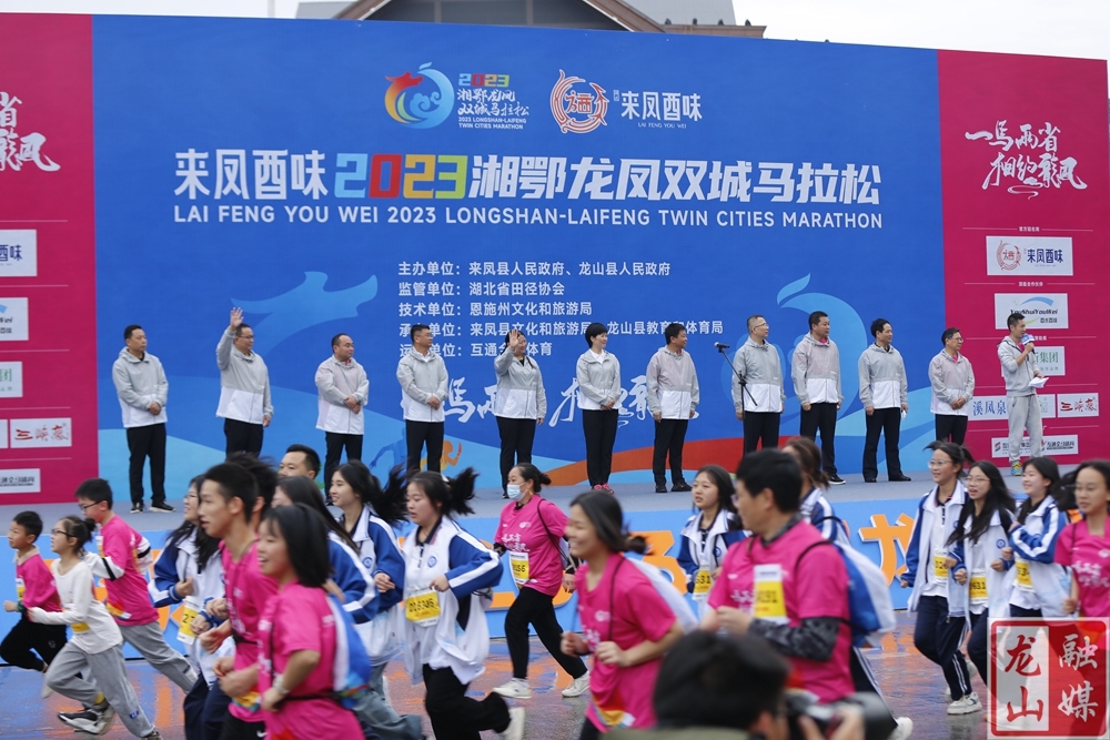 龙山县融媒体中心4月29日讯(记者 黄超)4月29日上午7时30分,2023湘鄂龙凤双城马拉松在湖北省恩施土家族苗族自治州来凤县、湖南省湘西土家族苗族自治州龙山县火热开赛,来自五湖四海的约2万名马拉松运动员和跑步爱好者用脚步丈量“活力龙凤”“团结龙凤”“特色龙凤”的城市魅力,触摸两城的历史脉搏。