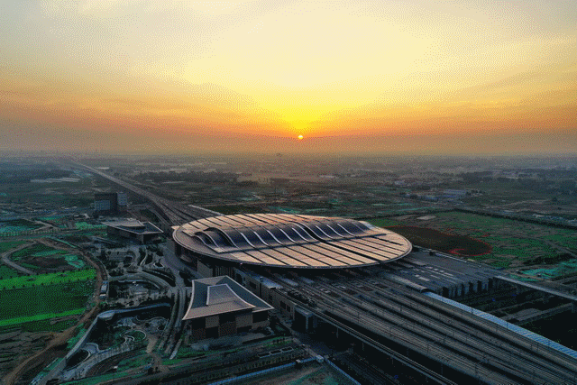 京雄城际铁路雄安站站顶分布式光伏电站(2023年3月23日摄,无人机照片)。 新华社记者 牟宇 摄