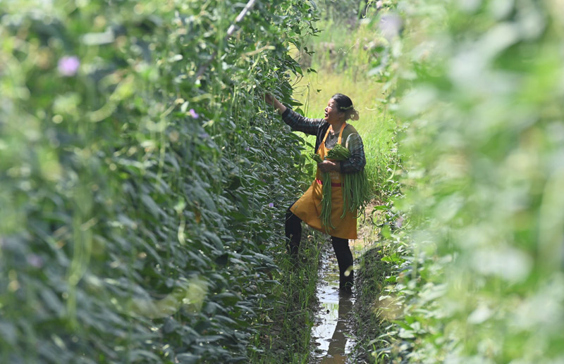 △2023年6月15日,在广西柳州市鹿寨县中渡镇石墨村,村民在高标准农田里采收豆角。