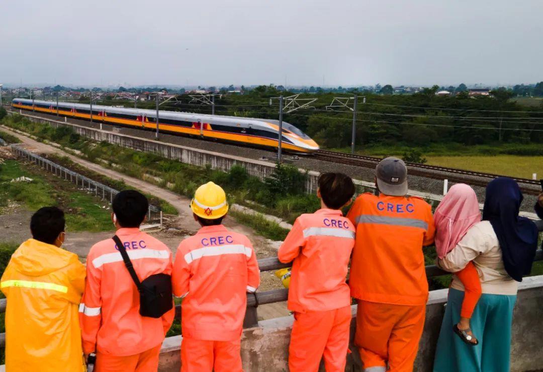 △2022年11月,在印度尼西亚万隆,雅万高铁建设者和当地民众观看高速铁路综合检测车行驶在雅万高铁试验段。