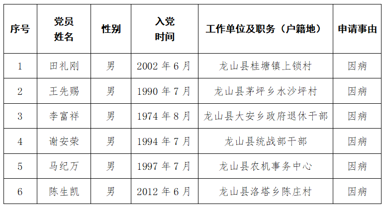 按照《龙山县“双维”帮扶基金管理办法(试行)》的有关规定,经党员个人申请、党支部初审、党委(党工委、党总支)审核、县党务服务中心调查、县委组织部部务会研究,拟对田礼刚等6名申请对象进行救助,现将有关情况予以公示。