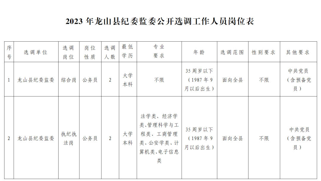 1.《龙山县纪委监委公开选调工作人员岗位表》