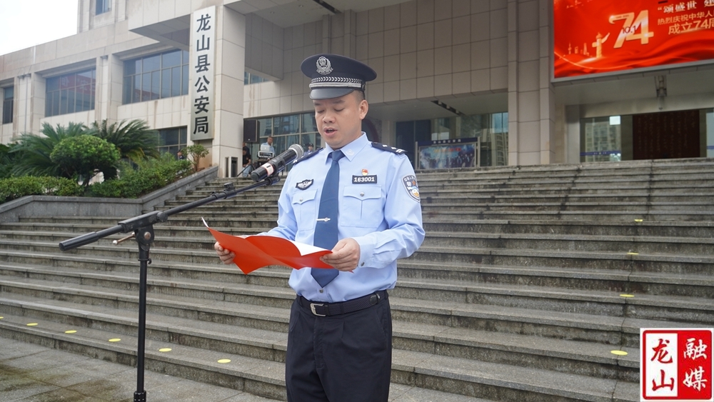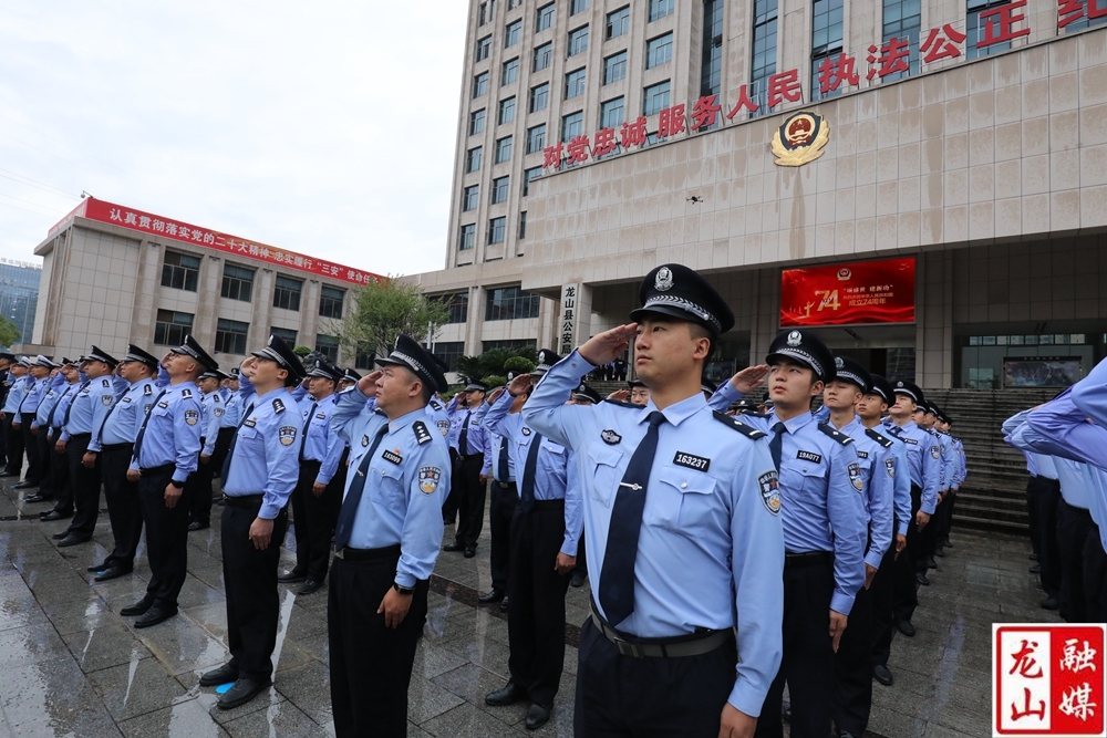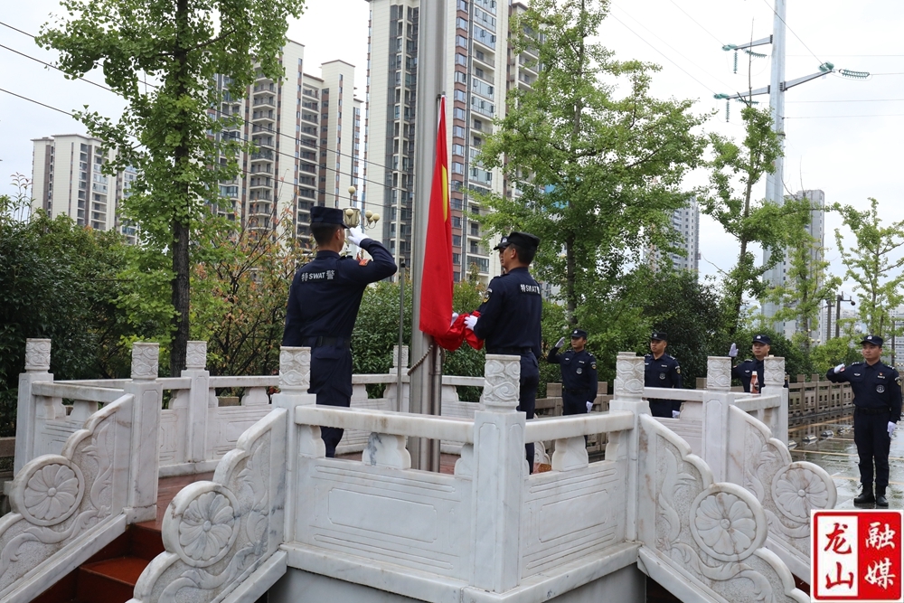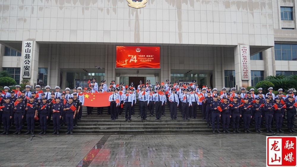 龙山县融媒体中心10月1日讯(记者 刘润 彭明)10月1日国庆节当天,县公安局200多名公安民辅警举行升国旗仪式,祝愿祖国繁荣昌盛、国泰民安,进一步激发所有干警的爱国情怀。副县长、县公安局局长吴昱杰参加仪式。
