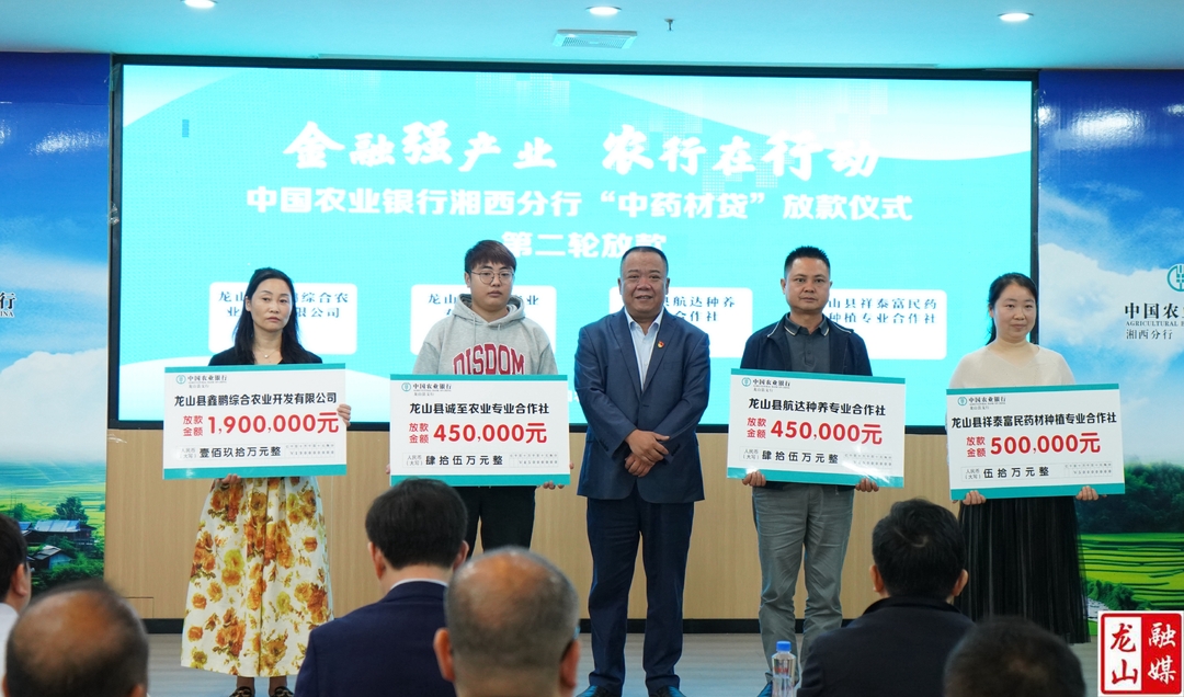 发布会现场为龙山县森焱中药材有限公司、龙山县柏康中药材专业合作社、龙山县夏秋现代农机专业合作社、湘西森旺中药材种植开发有限公司等8家合作社、企业发放贷款共计1130万元。