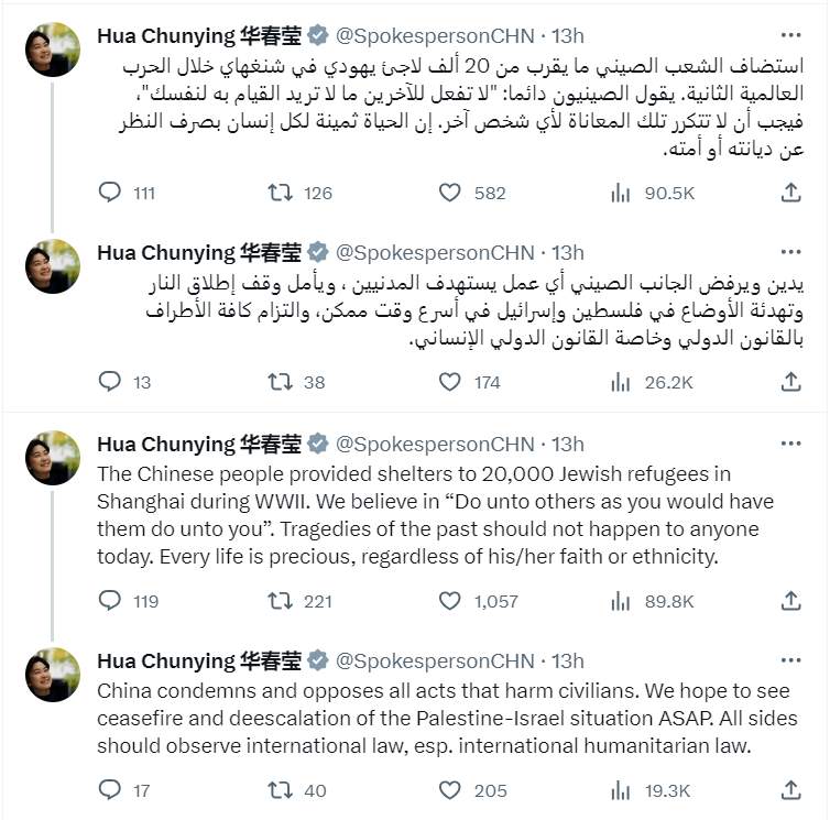 10月15日,中国外交部发言人华春莹在社交平台X(原推特)上用英语与阿拉伯语发文称,上海曾为2万名犹太难民提供庇护,过去的悲剧不应发生在今天的任何人身上。