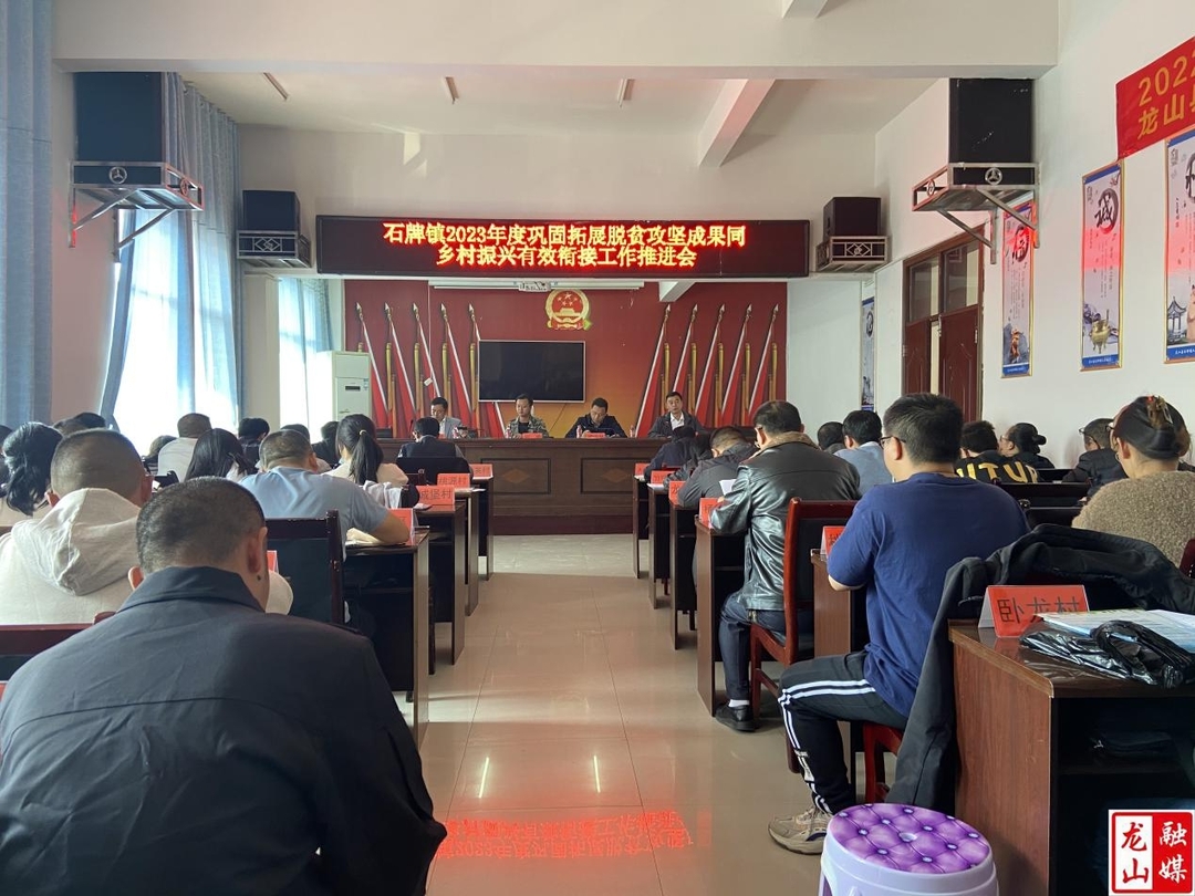 县乡村振兴局、县驻村办相关负责人,石牌镇全体政府干部,驻村帮扶工作队队长,18个村(社区)党支部书记、秘书及驻村干部等110余人参加会议。