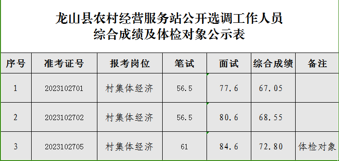 4.龙山县农村经营服务站公开选调工作人员综合成绩及体检对象公示表: