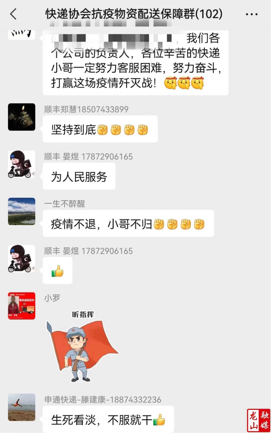 “作为快递行业的一员,我们要与各行各业默默付出的战友们并肩战斗。”如往常一样,彭剑波在群里鼓舞大家。