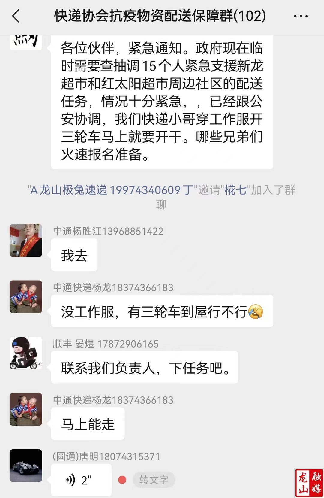 “紧急通知:现需抽调15人紧急支援新龙超市和红太阳超市周边社区的配送任务,情况紧急,请火速报名。”