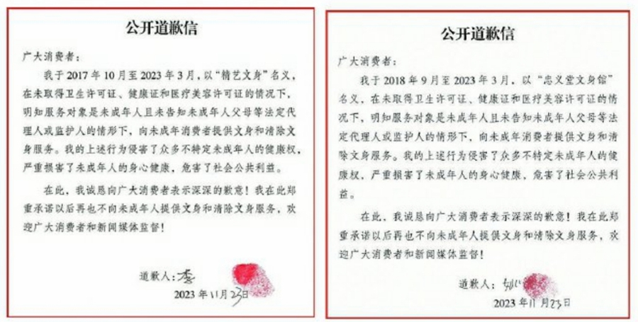 “我的行为侵害了众多不特定未成年人的健康权,严重损害了未成年人的身心健康,危害了社会公共利益。在此,我诚恳向广大消费者表示深深的歉意……”该美甲店、姚某当庭宣读道歉信,并与重庆市消费者权益保护委员会、重庆市人民检察院第二分院达成调解协议,约定该美甲店、姚某立即停止向未成年人提供文身服务,并就其向不特定未成年人提供文身服务的行为,在媒体上公开赔礼道歉。