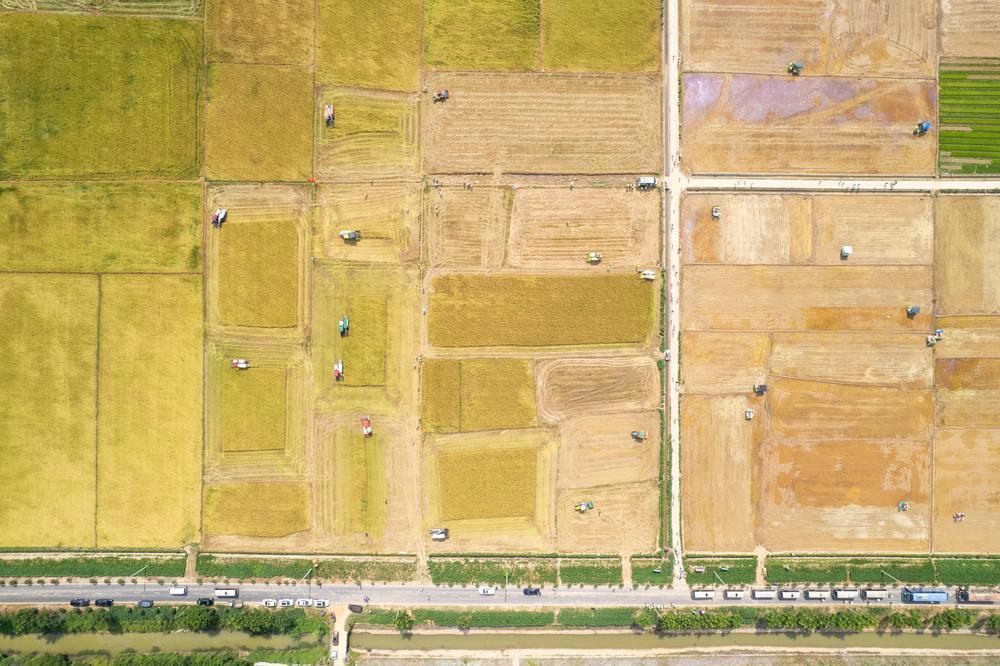 2023年7月13日,在汉寿县岩汪湖镇武竺山村,农民驾驶农机进行农事比拼(无人机照片)。当日,湖南省常德市农业农村部门在当地举行水稻夏收夏种机收减损现场观摩活动,引导广大农民和农机手在生产实践中精操作、比技能,全力保障夏粮丰产丰收、颗粒归仓。