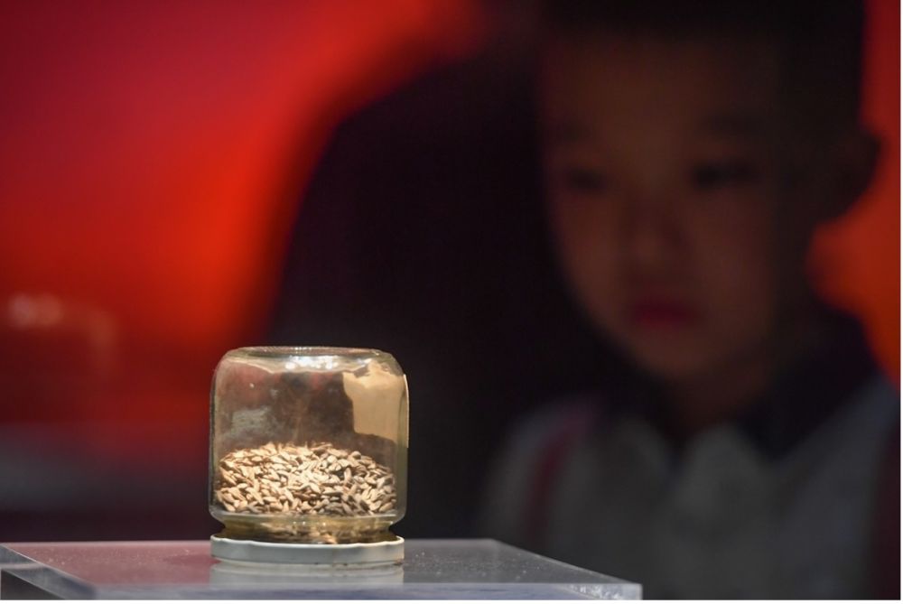 2023年8月26日,在长沙市芙蓉区的隆平水稻博物馆,小朋友在参观马王堆1号汉墓出土的稻谷。