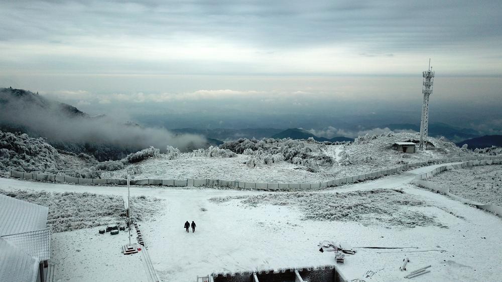 2023年12月19日,电力巡检员尹斌和龙昱君前往110千伏西公线003号监视哨所观测冰情(无人机照片)。海拔1420米的西晃山上,110千伏西公线为怀化地区提供电能,每年都是湖南省内最早结冰的输电线路之一。在这里,电力“哨兵”风雪中守护万家灯火。