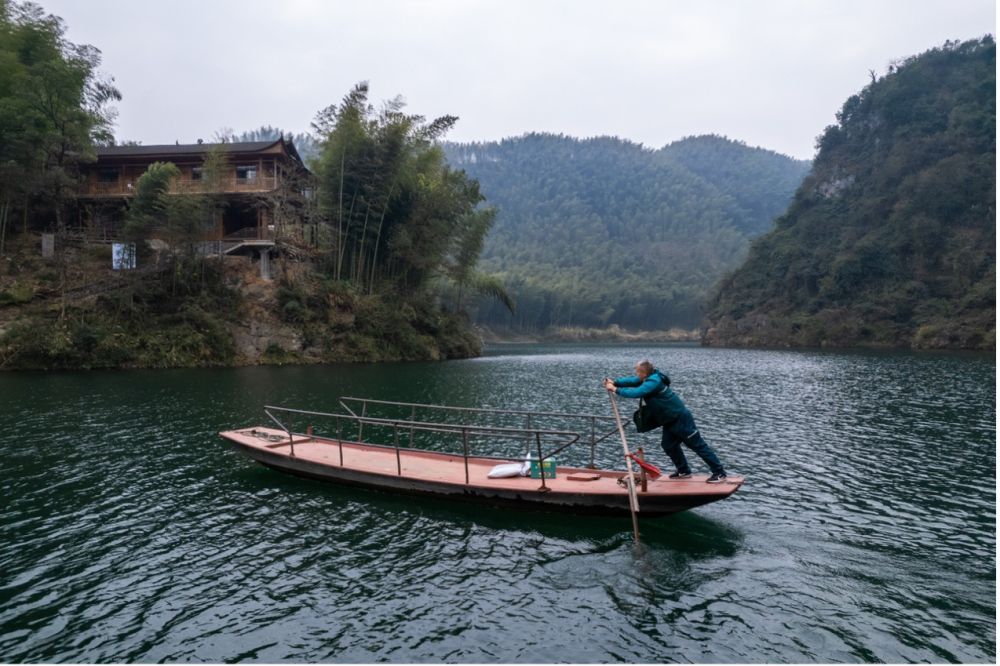 2023年12月22日,在常德市桃源县夷望溪镇大樟树村,邮政投递员王天明划船派送包裹(无人机照片)。王天明奔波在田野和山间近30年,投递里程达80万里,投递各类报刊、邮件约50万件,无一差错,当地群众称他为“活邮局”。