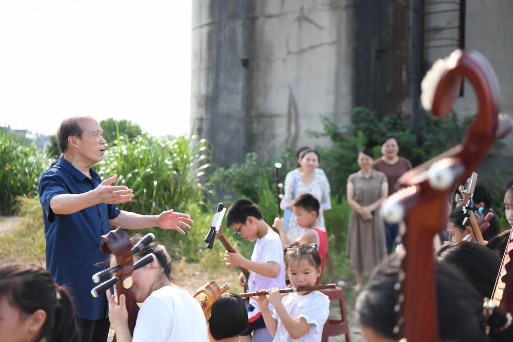 2023年8月12日,李舒尤(左一)在枧头洲村户外指挥学生们合奏。1944年出生的李舒尤,在家乡枧头洲村开起了乐器公益课堂——“舒尤乐坊”,利用周末和寒暑假免费教授孩子们各类乐器。2023年暑期,共有90多名学生在舒尤乐坊学习。