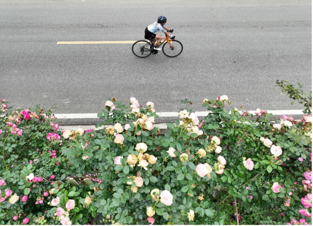 2023年5月20日,一名骑行爱好者在骑行途中(无人机照片)。当日,300余名骑行爱好者从湖南省长沙市宁乡市出发,骑行穿越益阳、常德,最终到达张家界国家森林公园吴家峪门票站。