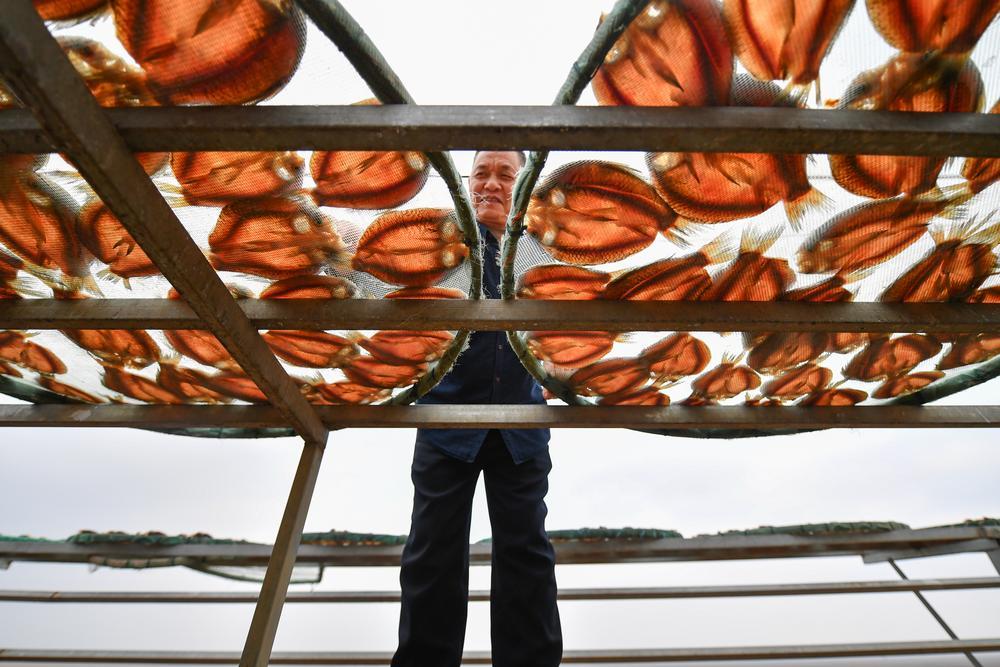 2023年1月12日,在岳阳市君山区钱粮湖镇六门闸社区生态渔村,居民在整理晾晒中的鱼干。近年,君山区实施“百村千人”直播带货人才培养计划,助推上岸渔民创业增收,助力乡村振兴。