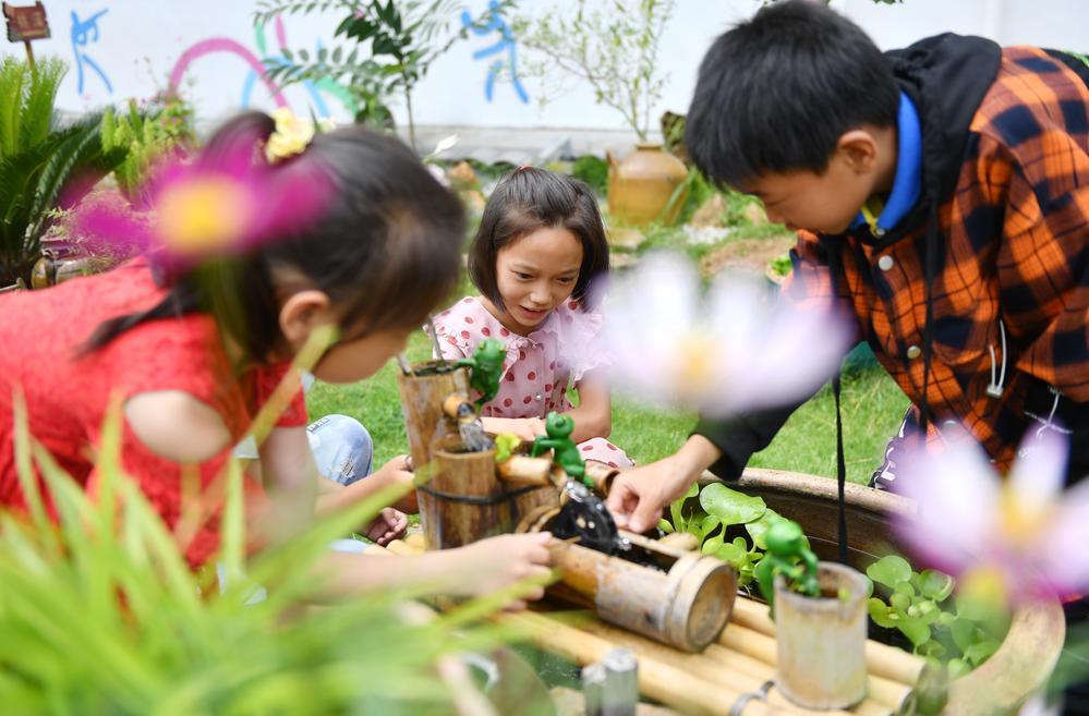 2023年3月4日,小朋友在湖南常宁市罗桥镇樱花园内玩耍。3000多亩樱花次第绽放,春色满园。