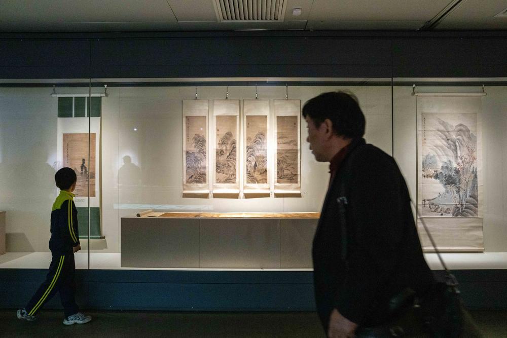 2023年11月5日,在湘潭市博物馆,观众从齐白石作品《山水四条屏》前走过。当日,“望白云家山难舍——齐白石原作展”在湖南省湘潭市博物馆开幕。