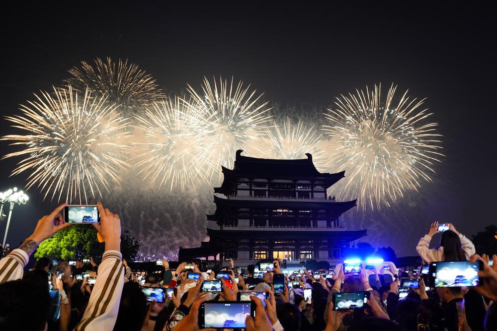 2023年5月11日,市民在长沙杜甫江阁附近观看焰火晚会。