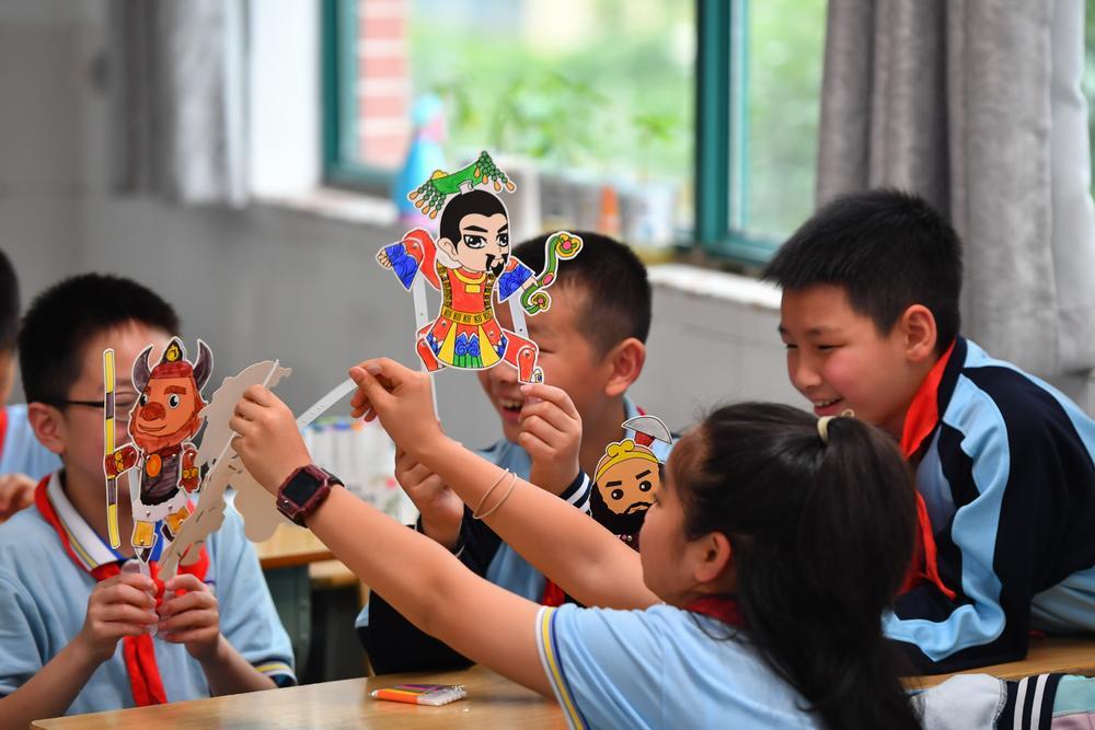 2023年5月15日,在长沙市天心区红卫小学,学生在皮影戏课上相互展示自己制作的皮影戏道具。该校设计了丰富的课后服务内容,让学生零距离感受非遗,激发学生对传统文化的兴趣,助力“双减”。