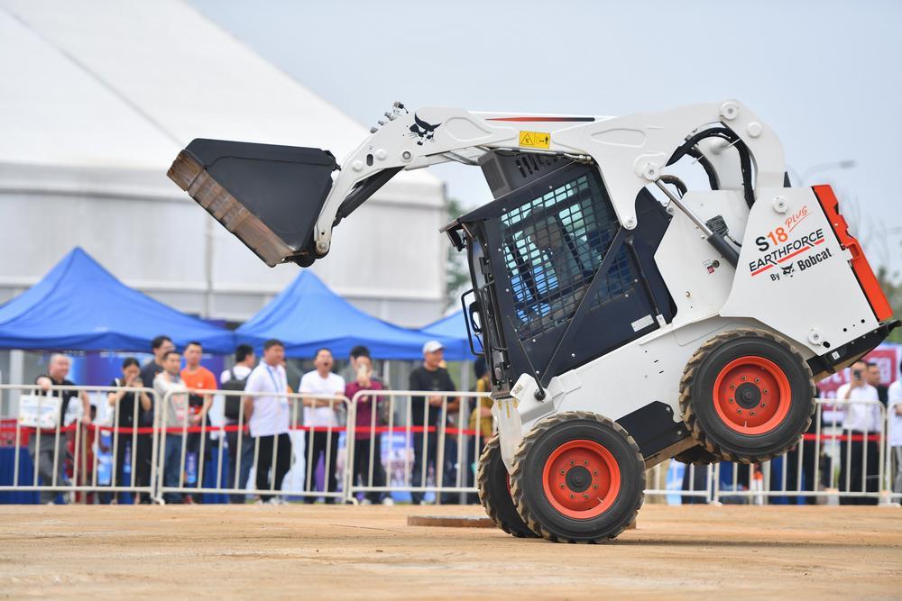 2023年5月12日,观众在长沙国际工程机械展览会上观看工程机械装备展演。当日,机手们驾驶挖掘机和装载机进行整机漂移、“空中漫步”等,并摆出各种造型、秀“舞技”。