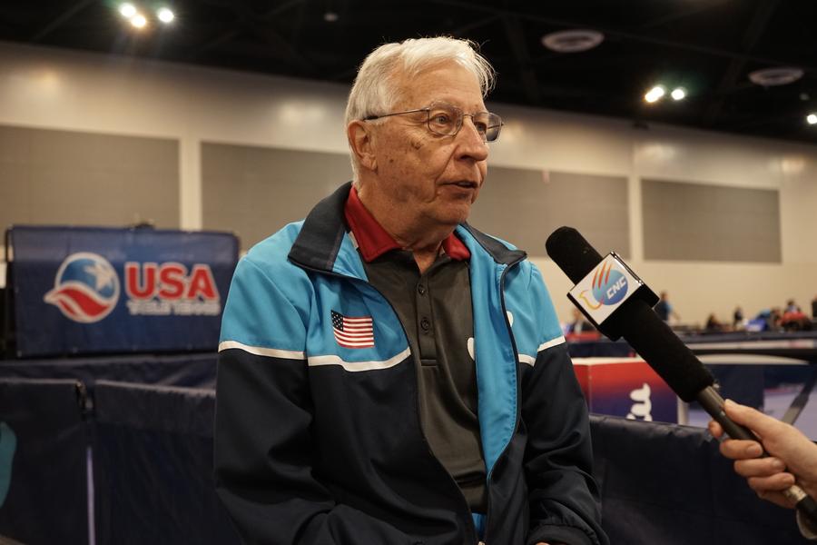 2023年12月16日,中美“乒乓外交”亲历者戴尔·斯威里斯在2023年美国乒乓球公开赛老年组比赛间隙接受新华社记者专访。