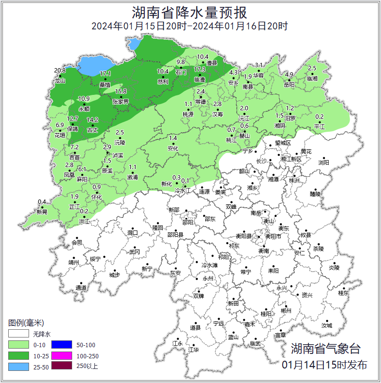 15日晚上到16日白天, 怀化中北部、娄底北部、益阳、岳阳、湘西州、张家界、常德阴天有小雨,其中湘西州北部、张家界北部、常德北部局地中到大雨,其他地区多云间晴天;北风2~3级;最高气温湘南17~19℃,湘西北5~7℃,其他地区11~13℃;最低气温湘北3~5℃,其他地区7~9℃。