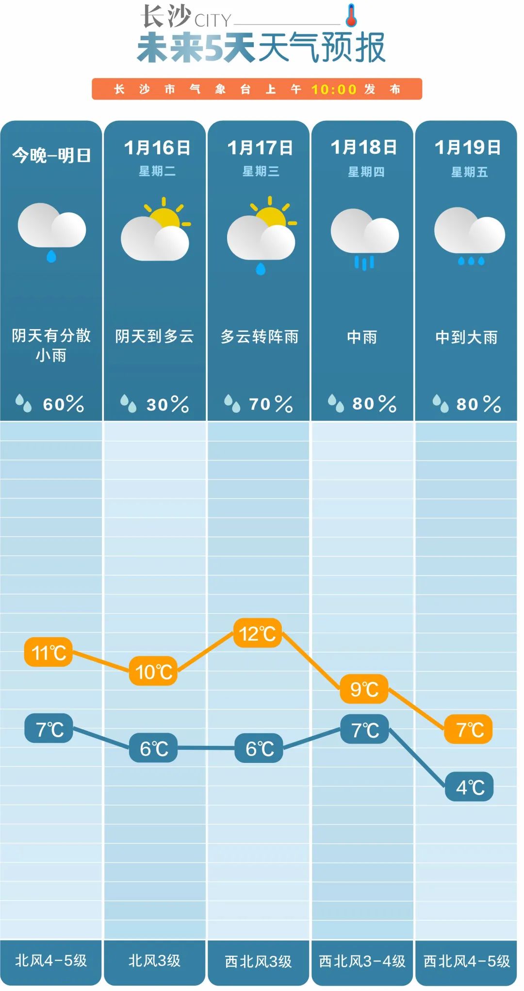 16日晚上到17日白天, 湘西州、张家界、常德、益阳、岳阳、怀化、娄底、邵阳、湘潭、长沙西部阴天有小到中雨,其他地区多云间晴天;北风2~3级;最高气温湘南20~22℃,湘西北5~7℃,其他地区12~14℃;最低气温湘北3~5℃,其他地区7~9℃。