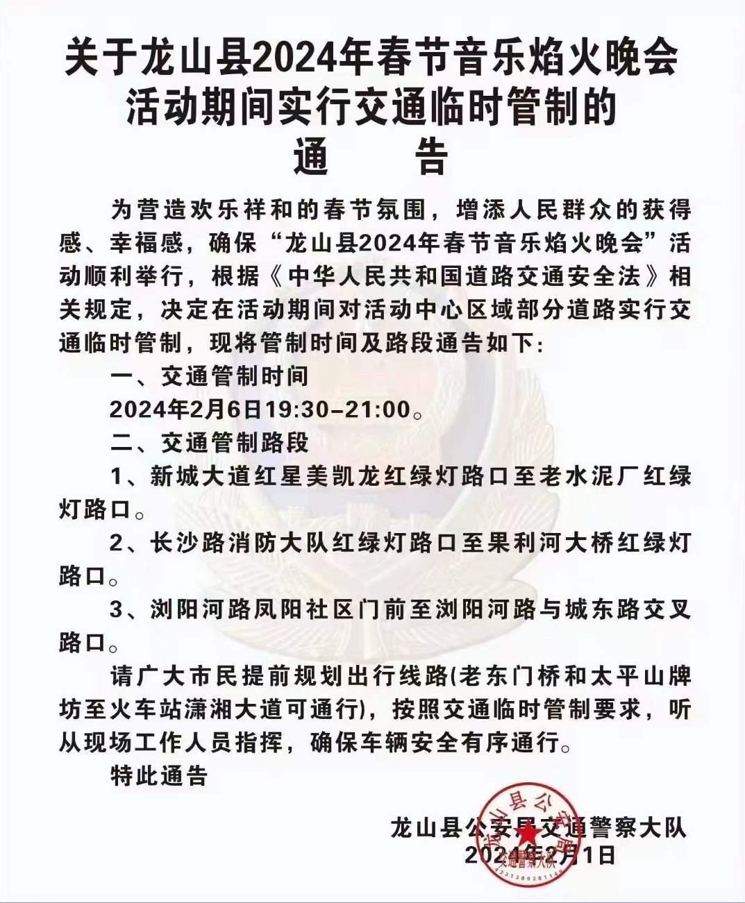 关于龙山县2024年春节音乐焰火晚会活动期间实行交通临时管制的通告