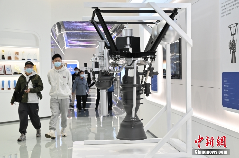 中科空天飞行科技产业化基地在广州南沙投产。图为中科空天飞行科技产业化基地展厅展示的液体发动机模型吸引参观者。 中新社记者 陈楚红 摄