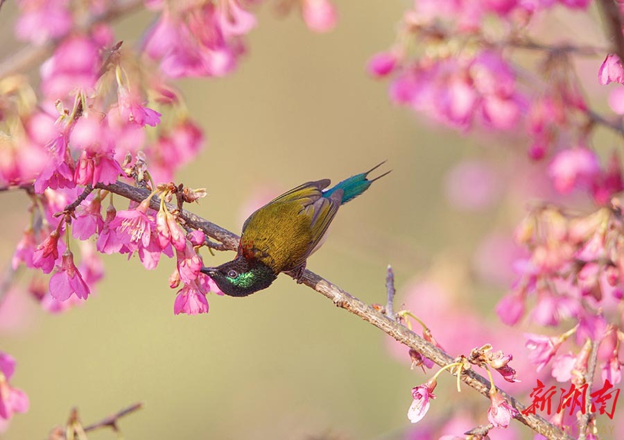 2月18日,湖南省森林植物园,钟花樱竞相绽放,叉尾太阳鸟闻香而至,饱食花蜜,“描绘”出一幅动人的春天花鸟图。   湖南日报全媒体记者 张京明 摄