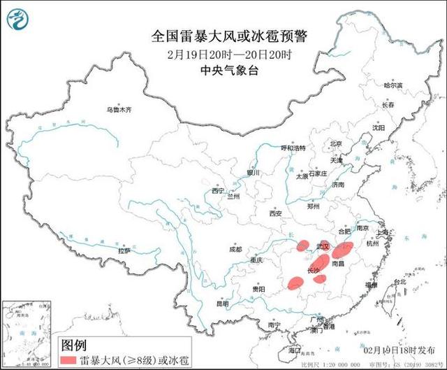 强对流天气蓝色预警:预计2月19日20时至20日20时,安徽南部、湖北东部和南部、湖南中南部、江西中北部、广西东北部等地的局地将有8-10级雷暴大风或冰雹天气;安徽中南部、江苏南部、湖北东部、湖南东北部、江西北部等地的部分地区将有短时强降水天气,最大小时雨量20-30毫米,局地可达35毫米以上。