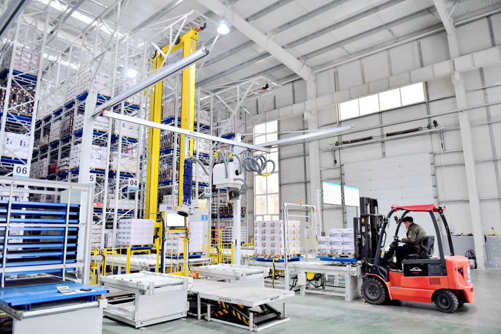 2月20日,在邯郸市永年区一家紧固件生产企业,工人在智能仓储车间装卸货物。新华社记者 王晓 摄