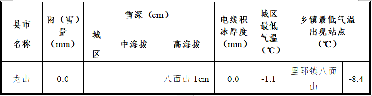 23日08时~17时,我县阴天有零星雨夹雪,冰冻和道路结冰有所发展。国家站雨雪量不足0.1mm,电线覆冰厚度0mm,城区无积雪,高海拔地区积雪深度1cm左右。城区最低气温为-1.1℃,乡镇最低气温为-8.4℃(里耶镇八面山)