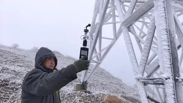 (电力抢险人员监测输电线路覆冰情况。通讯员摄)