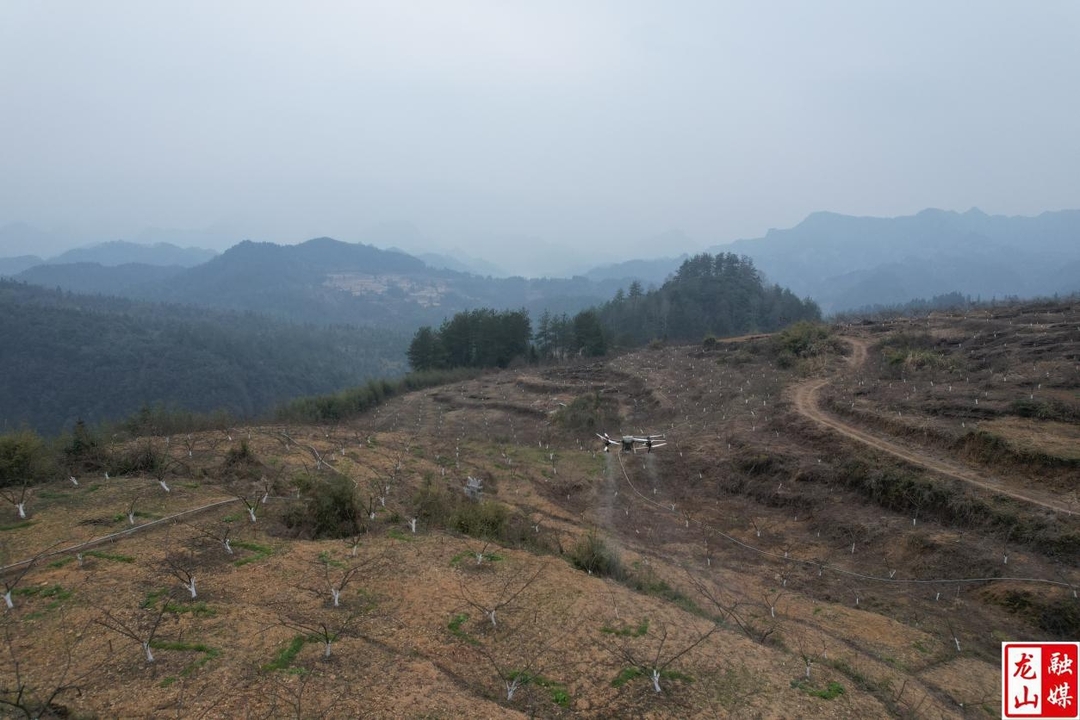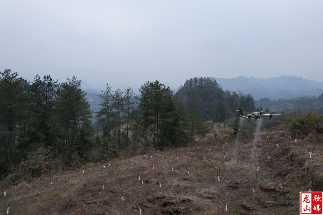 3月1日,在龙山县内溪乡岩力村的蜜汁李产业基地上空,伴随着螺旋桨的轰鸣声,一架携带农药的植保无人机在匀速飞行,把雾化的农药均匀地喷洒在李树上。图/文 刘卓雅 廖铁岩