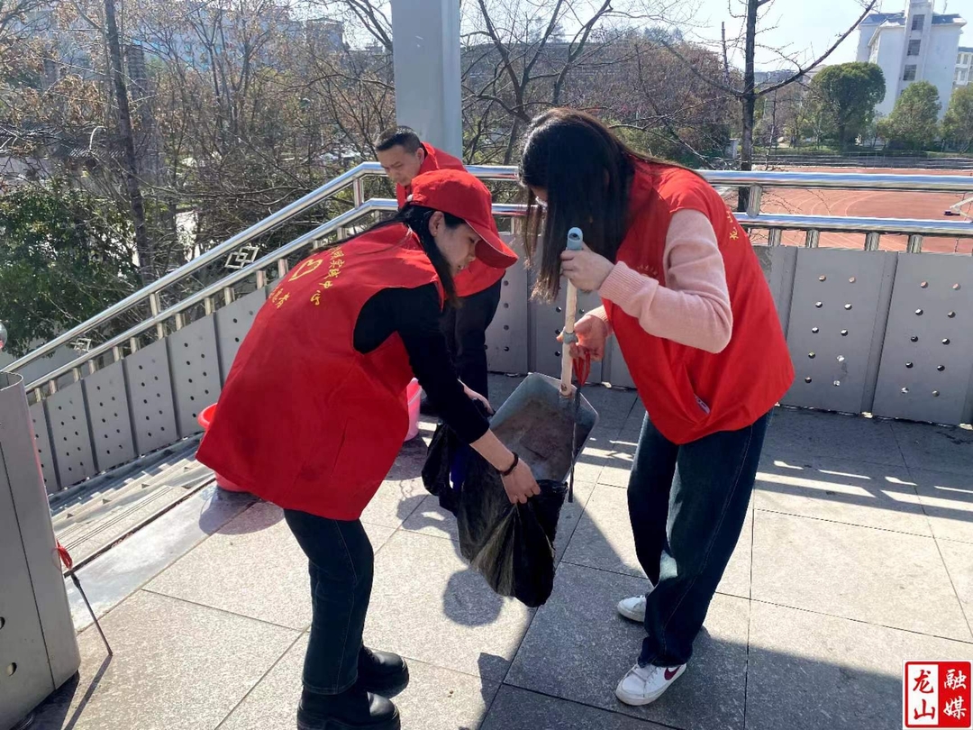 龙山县融媒体中心3月12日讯(通讯员  向思燕 张橙濛 符华)“这个夹缝里比较脏,要用火钳夹一下。”3月11日,县教体局10余名青年志愿者来到唯一社区岳麓大道人行天桥,开展“四季同行·雷锋家乡学雷锋”暨文明实践我是行动者志愿服务活动。