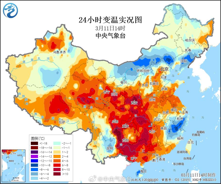 11日北方“万里无云”,白天升温速度非常快,截至11日14时,北京16.3℃,石家庄20℃,西安20.3℃,郑州22℃,均为今年来新高。