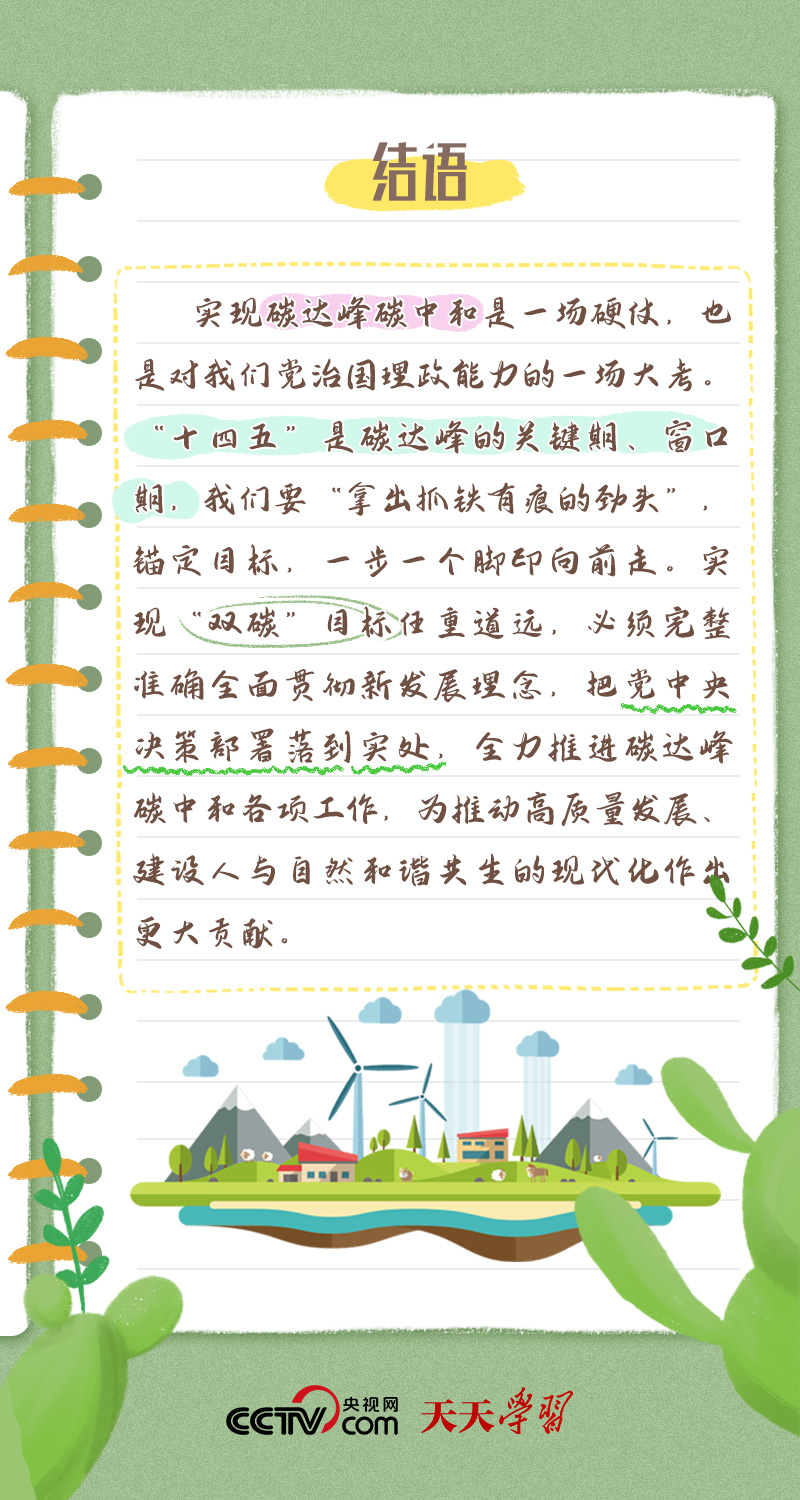 天天学习 今年全国两会,习近平总书记在政协联组会上,对“双碳”工作作出最新部署。总书记强调:“全面准确落实精准治污、科学治污、依法治污方针,推动经济社会发展绿色化、低碳化,加强资源节约集约循环利用,拓展生态产品价值实现路径,积极稳妥推进碳达峰碳中和,为高质量发展注入新动能、塑造新优势。”实现碳达峰碳中和,是以习近平同志为核心的党中央统筹国内国际两个大局作出的重大战略决策,是着力解决资源环境约束突出问题、实现中华民族永续发展的必然选择,是对推动构建人类命运共同体的庄严承诺。