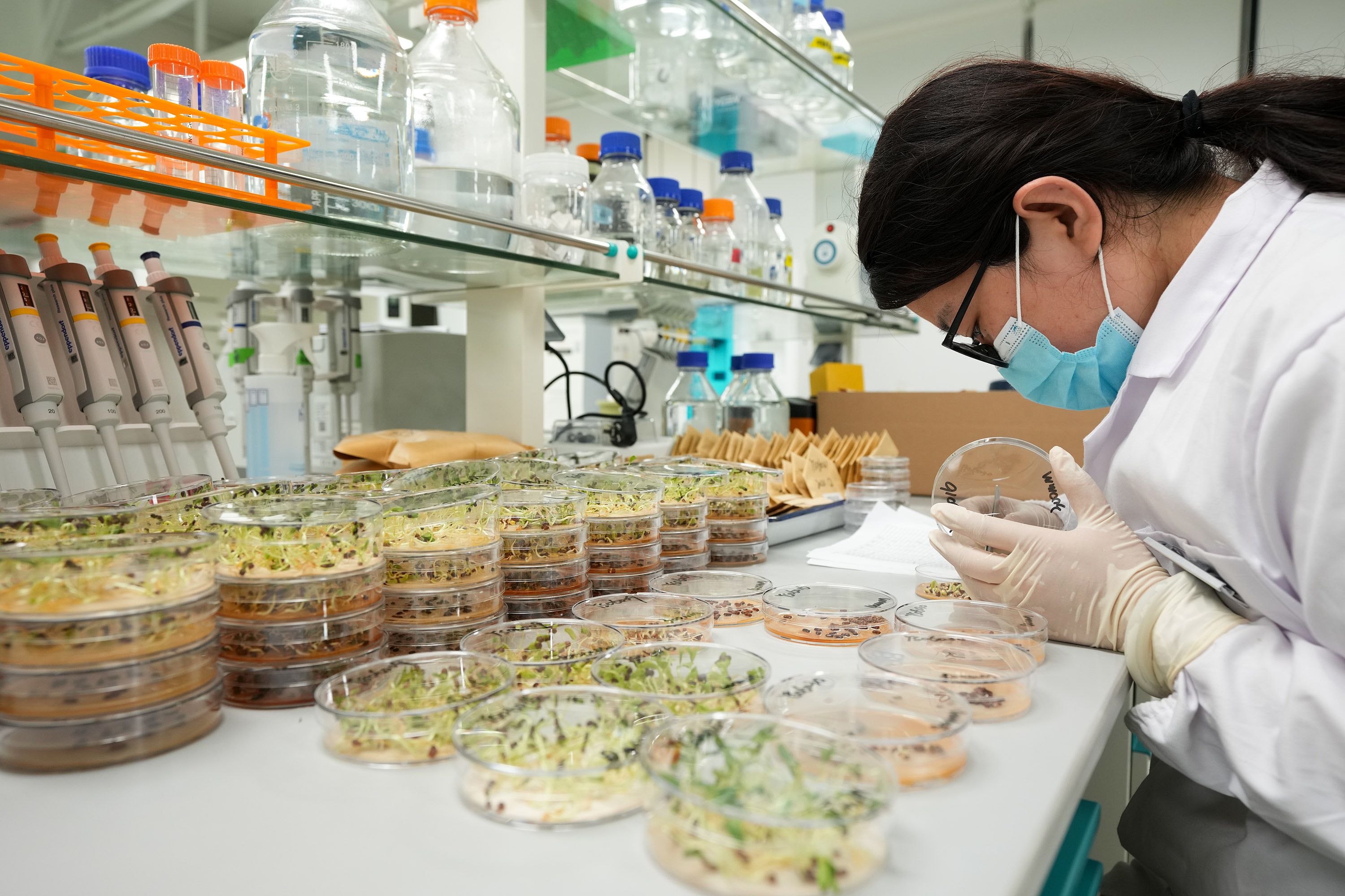 △ 海南三亚崖州湾科技城的崖州湾种子实验室,科研人员正在观察种子样本。