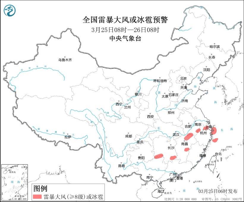 预计3月25日08时至26日08时,安徽南部、湖南南部、江西中北部、浙江北部、广西东北部等地的部分地区将有8—10级雷暴大风或冰雹天气;安徽南部、江苏南部、上海西南部、湖南南部、江西、浙江中北部和东南部、福建西北部、广西东北部等地的部分地区将有短时强降水天气,最大小时雨量20-40毫米,局地可达50毫米以上。